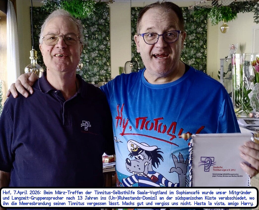 Für Erstinformationen, Terminfragen und erste Tipps für Betroffene stehen unsere Gruppensprecher gerne zur Verfügung. Zweiter Gruppensprecher Harry Apitz aus Oettersdorf bei Schleiz schöpft aus jahre-langer Erfahrung als Schöffe im Altenburger Sozialgericht, und Peter Vucic aus Berg-Hadermannsgrün, selbst seit 2002 beidseits betroffen und als Logopäde zum gepr. Audioberater (GIB) und ehrenamtlichen DTL-Tinnitusberater ausgebildet, hat dafür eine eigene Telefonnummer geschaltet: